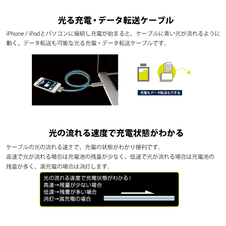 光の流れで充電量がわかる!iPhone/iPod用充電・データ転送ケーブル