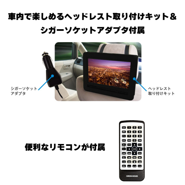 車内で楽しめるヘッドレスト取り付けキット&シガーソケットアダプタ付属