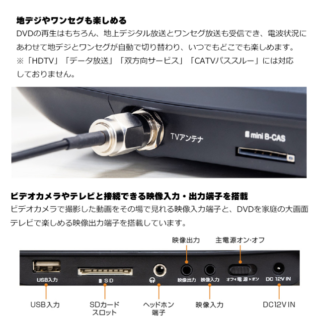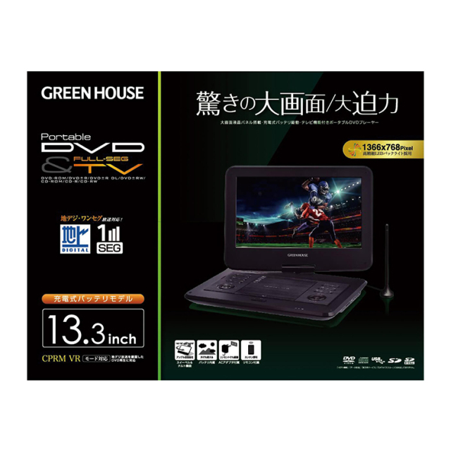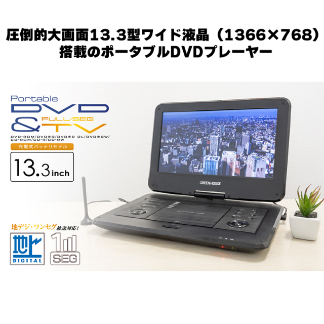 圧倒的大画面13.3型(1366×768)搭載のポータブルDVDプレーヤー地デジやワンセグも楽しめる