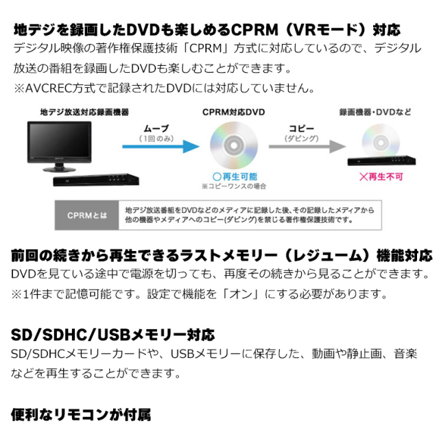 | 対応ディスクフォーマット | DVD-VIDEO / DVD-VR(CPRM対応) / CD-DA / データDVD / データCD |