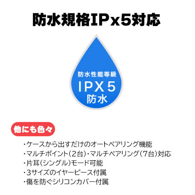 | 充電時間(イヤホン) | 約2時間(専用充電ケースにて約2.5回充電可能) |