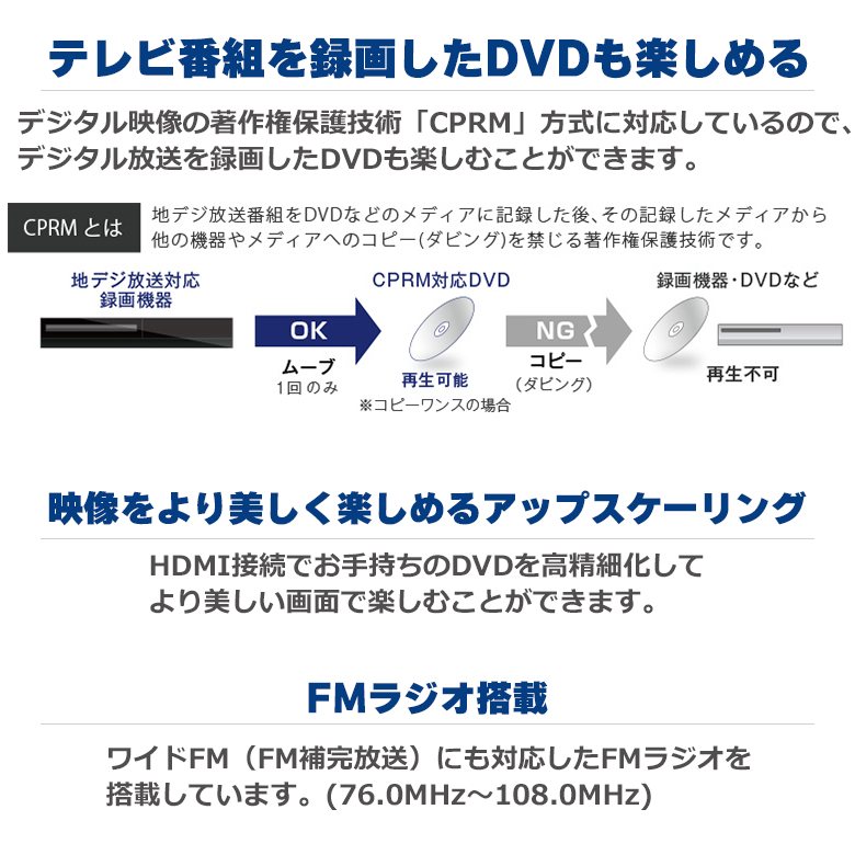 | 対応ディスクフォーマット | DVD-VIDEO / DVD-VR(CPRM対応) / データDVD / CD-DA / データCD |