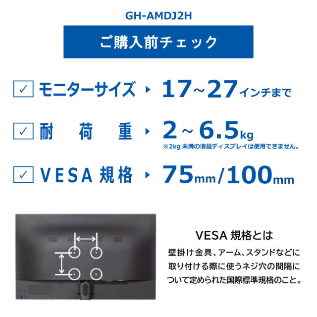 | 耐荷重 | 2kg~6.5kg ※2kg未満の液晶ディスプレイは使用できません。 |