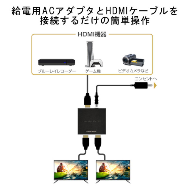 1つのHDMI機器の画像を2つのテレビに映しだすHDMI分配器