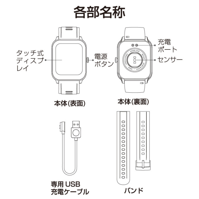 ベルト2セット*、専用USB充電ケーブル、取扱説明書、保証書