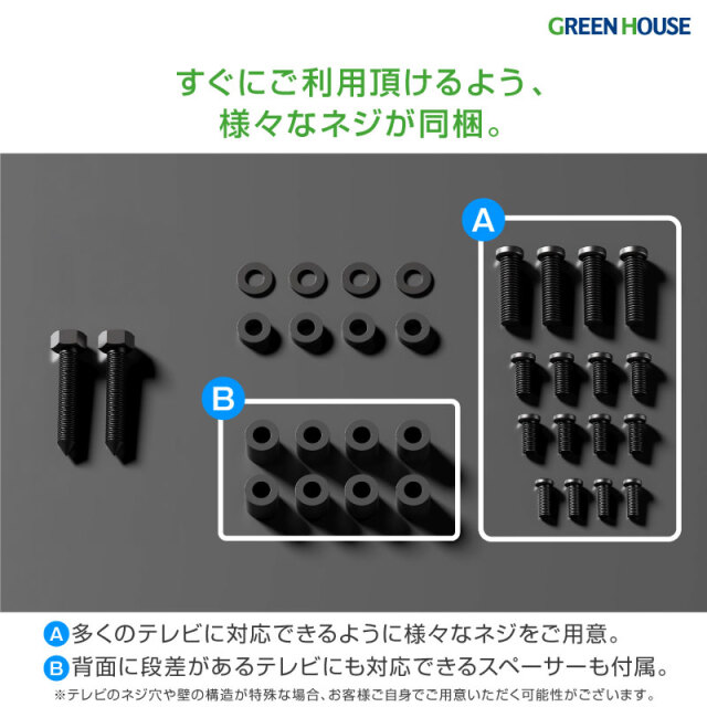 六角棒レンチ(4mm)、テレビ固定用ネジ(M4×14mm、M5×14mm、M6×14mm、M8×20mm)×各4本、テレビ固定用ワッシャー(小、大)×各4個、スペーサー×8個、壁用ボルト×2本、壁用ワッシャー×2個、取扱説明書/保証書
