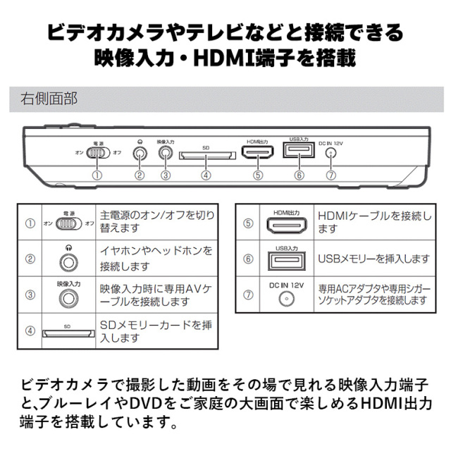 ・ビデオカメラやテレビなどと接続できる映像入力・HDMI出力端子を搭載