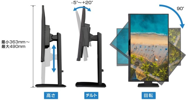 フルHD、昇降スタンド付き、23.8型ワイド液晶ディスプレイ