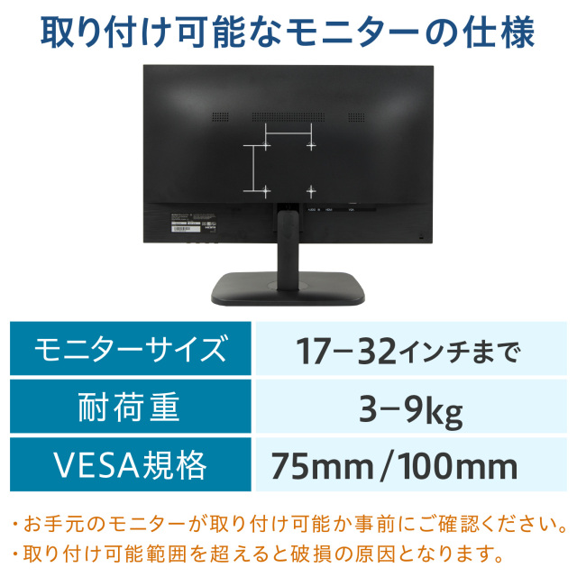 | 耐荷重 | 3~9kg ※3kg未満のディスプレイは使用できません。 |