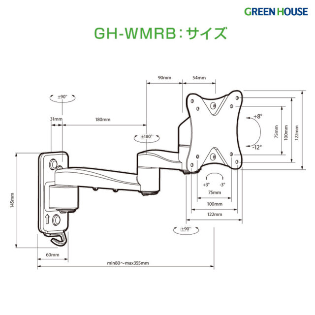 ・壁からテレビまでの距離は、アームを引き出せば355mmまで調節可能なロングアーム