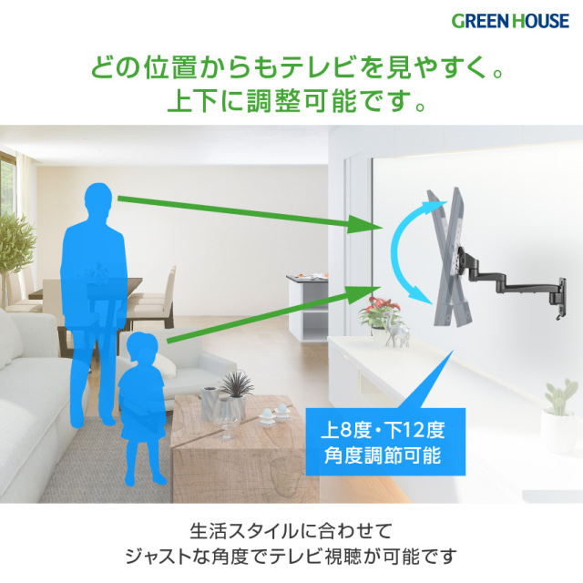 ・どの位置からもテレビを見やすく、上下に調整可能です