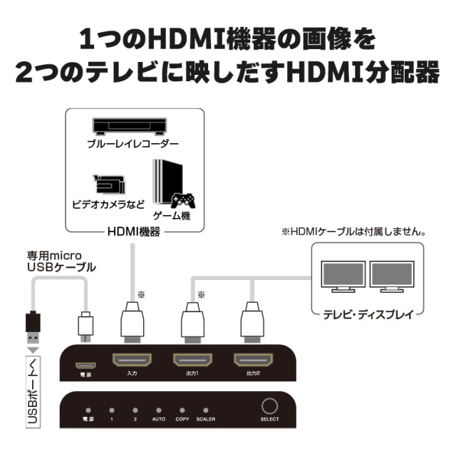 1つのHDMI機器の画像を2つのテレビに映しだすHDMI分配器
