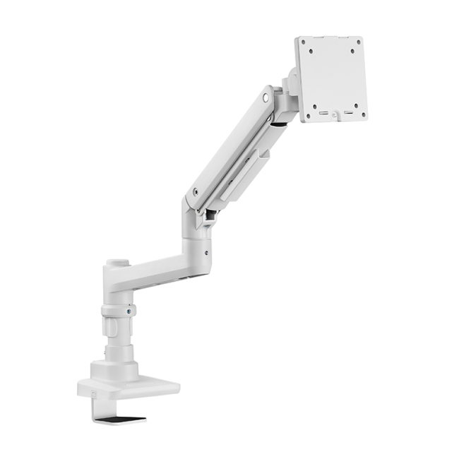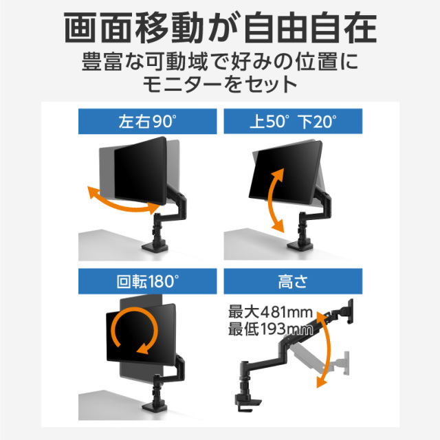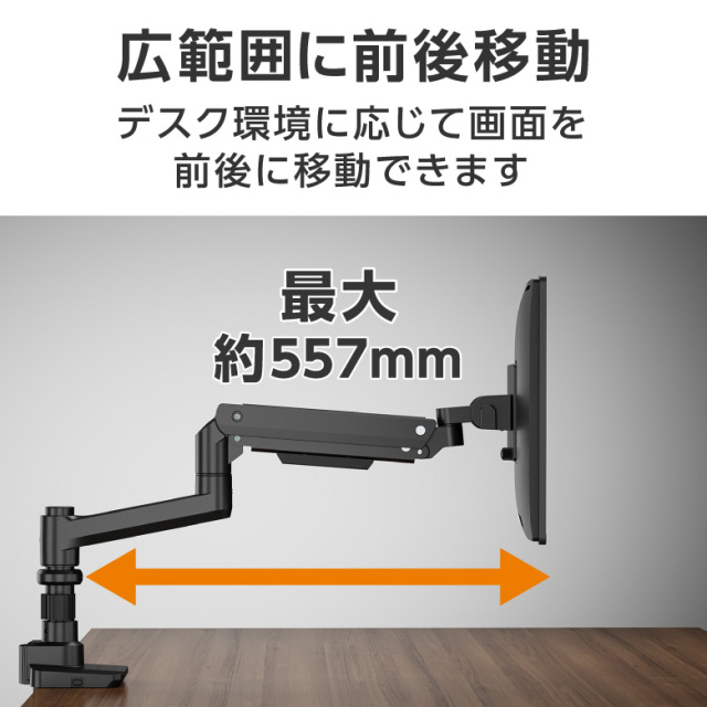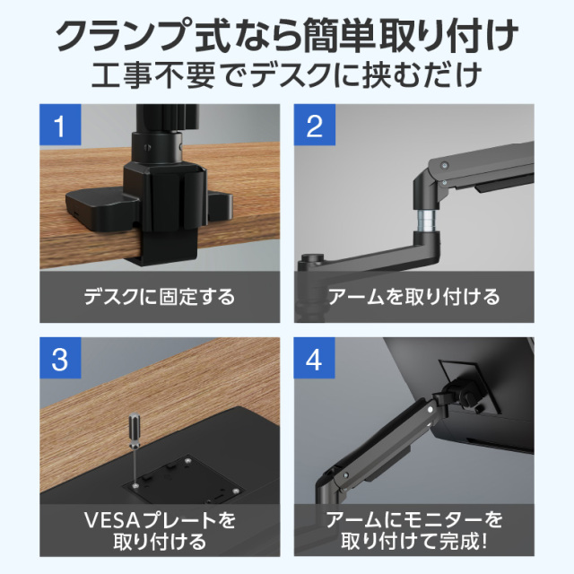机の上から締められるすっきりC型クランプを採用、大型モニターに対応した
