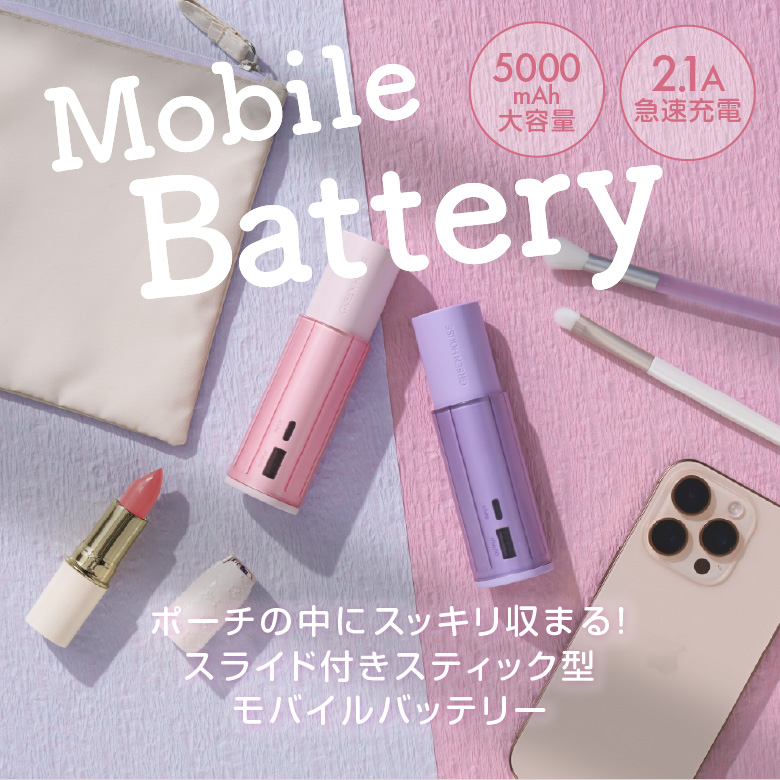バッグやポーチの中にスッキリ収まるおしゃれなスティック型モバイルバッテリーです。