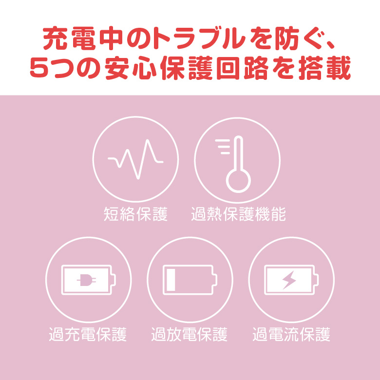 過充電、過放電、過電流、過熱、短絡の5つの保護機能を備えており、安心してご使用いただける回路設計になっています。