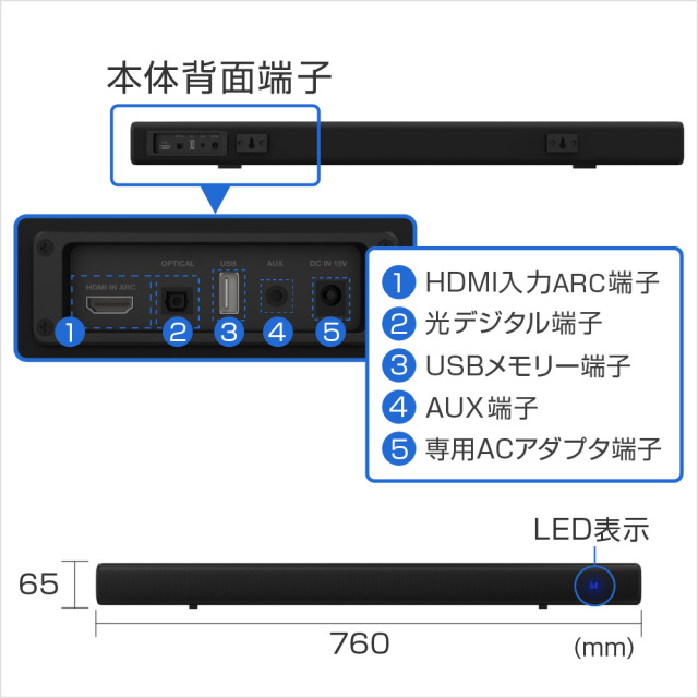 ・Bluetooth・HDMI(ARC)・光デジタル・3.5mmステレオミニ・