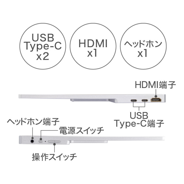 19ピンHDMI(Type-A)×1 24ピン USB Type-C×2(給電/映像入力兼用) 音声出力端子×1(ステレオミニジャック3.5mm) |