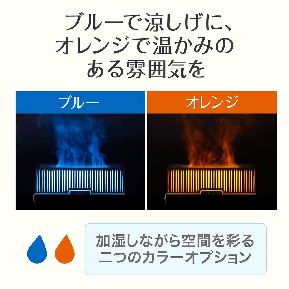 ライトアップで上面からのミストがまるでの炎のゆらぎのように癒されます。広口タンクでお手入れ簡単、アロマディフューザーとしても使えます。