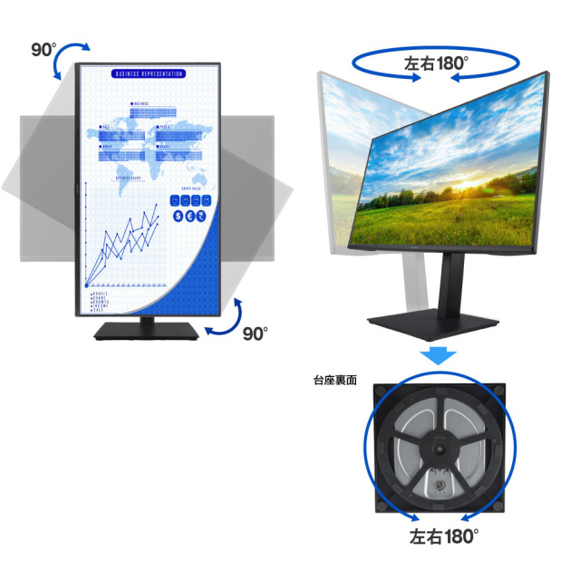 高さ調整、ピボット(画面回転)、台座回転機能の付いた昇降スタンド