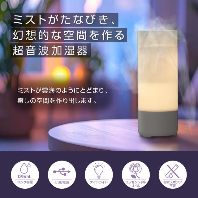 ミストがたなびき、幻想的な空間を作る超音波加湿器
