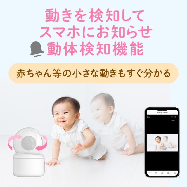 ・カメラの前でこどもやペットなど動くものを検知したら専用アプリへ通知する動体検知機能。