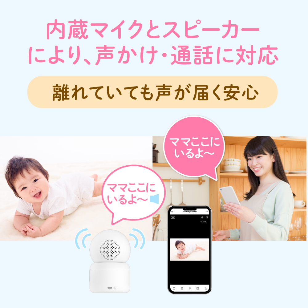 ・マイク・スピーカーを内蔵しており、専用アプリで離れた所から声をかけたり、通話することができます。