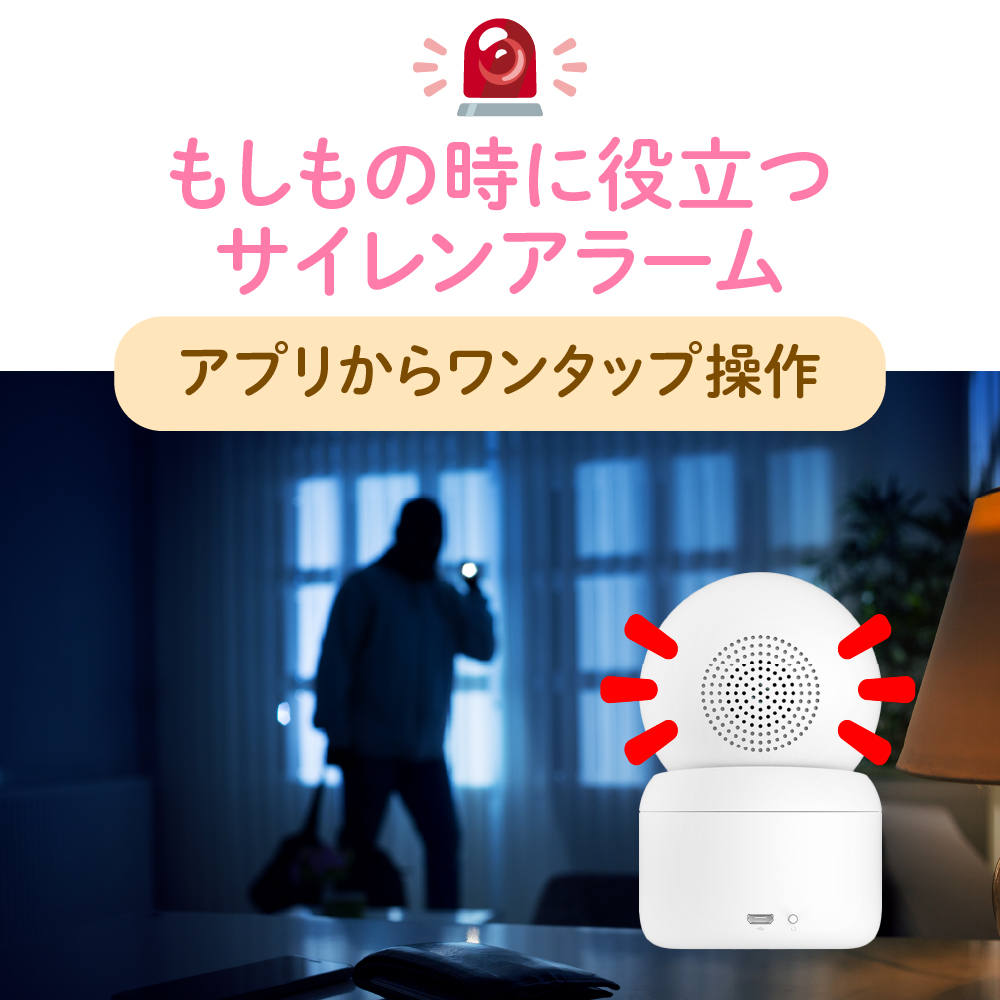 ・専用アプリの操作でカメラのスピーカーからサイレンアラーム音を鳴らすことできます。