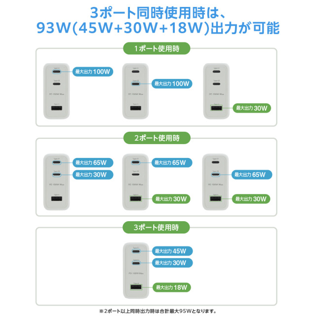 ・3ポート同時使用時は、93W(45W+30W+18W)出力が可能
