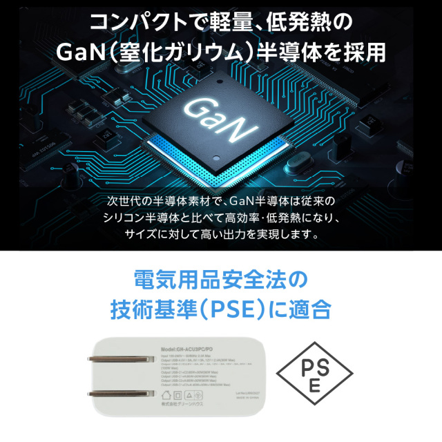 ・コンパクトで軽量、低発熱のGaN(窒化ガリウム)半導体を採用