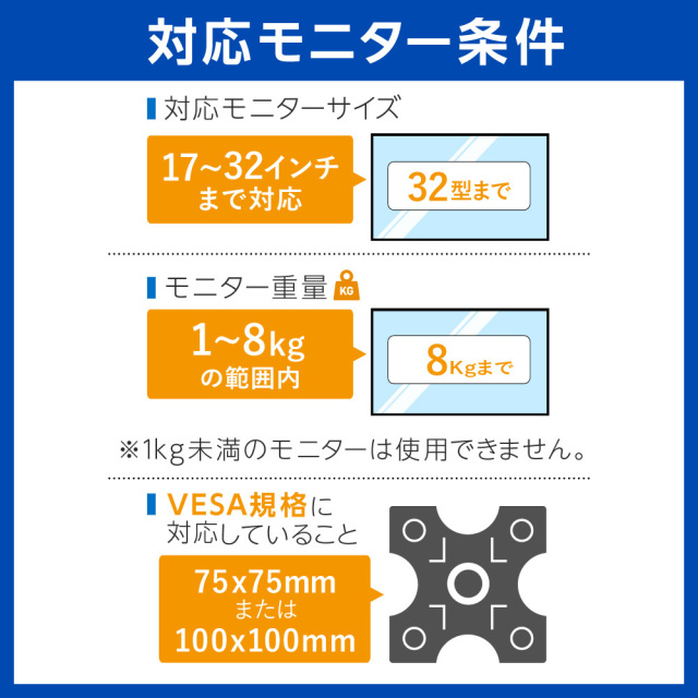 | 耐荷重 | 1~8kg※1kg未満の液晶ディスプレイは使用できません。 |