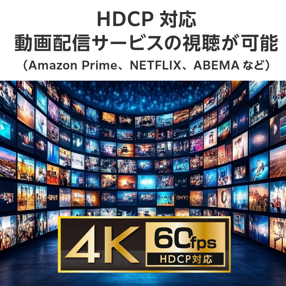 HDCP対応、動画配信サービスの視聴が可能(Amazon Prime、NETFLIX、ABEMAなど)