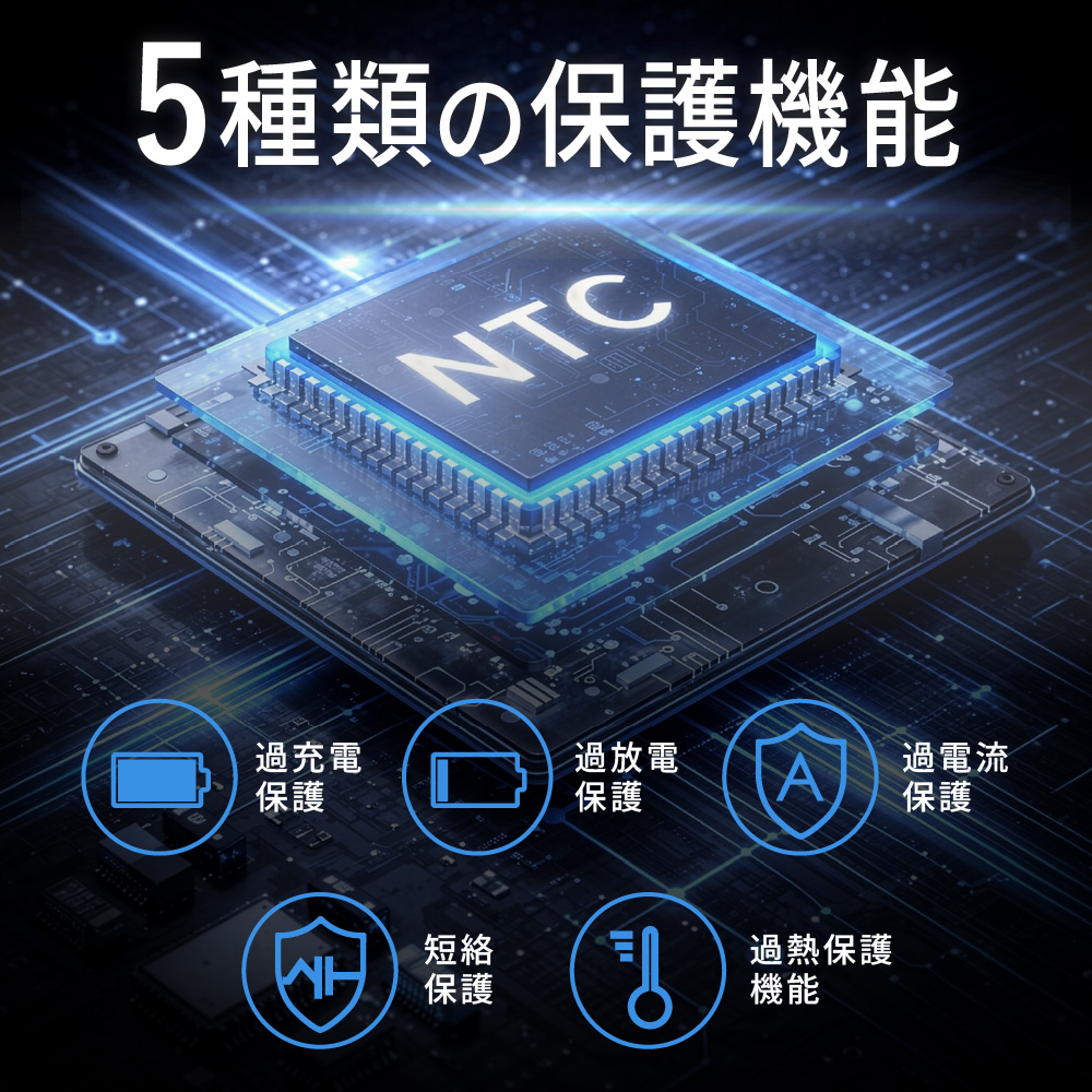 ・過充電保護、過放電保護、過電流保護、短絡保護、過熱保護機能を持つ安心設計