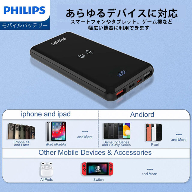 PD 対応 USB-C で給電能力を最大化、ワイヤレス充電にも対応しており、