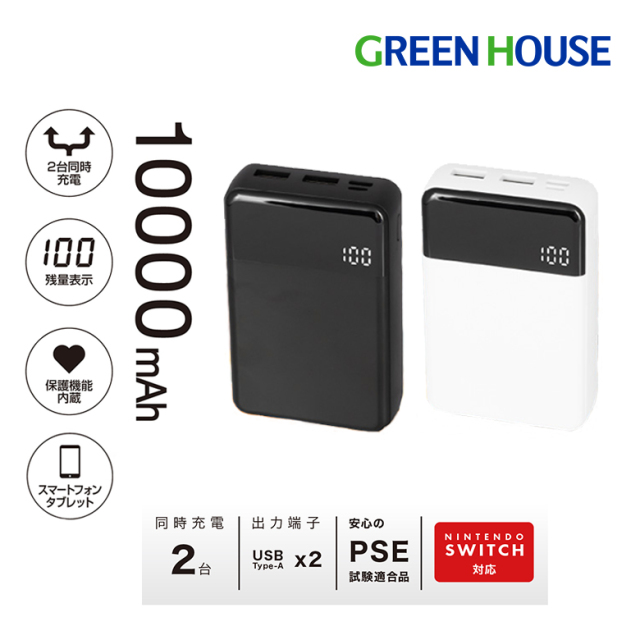 モバイルバッテリー 10000mAh 大容量 小型 軽量 コンパクト USB タイプC typeC 2台同時充電 スマホ PSE認証 iPhone15 GH-100EBA グリーンハウス